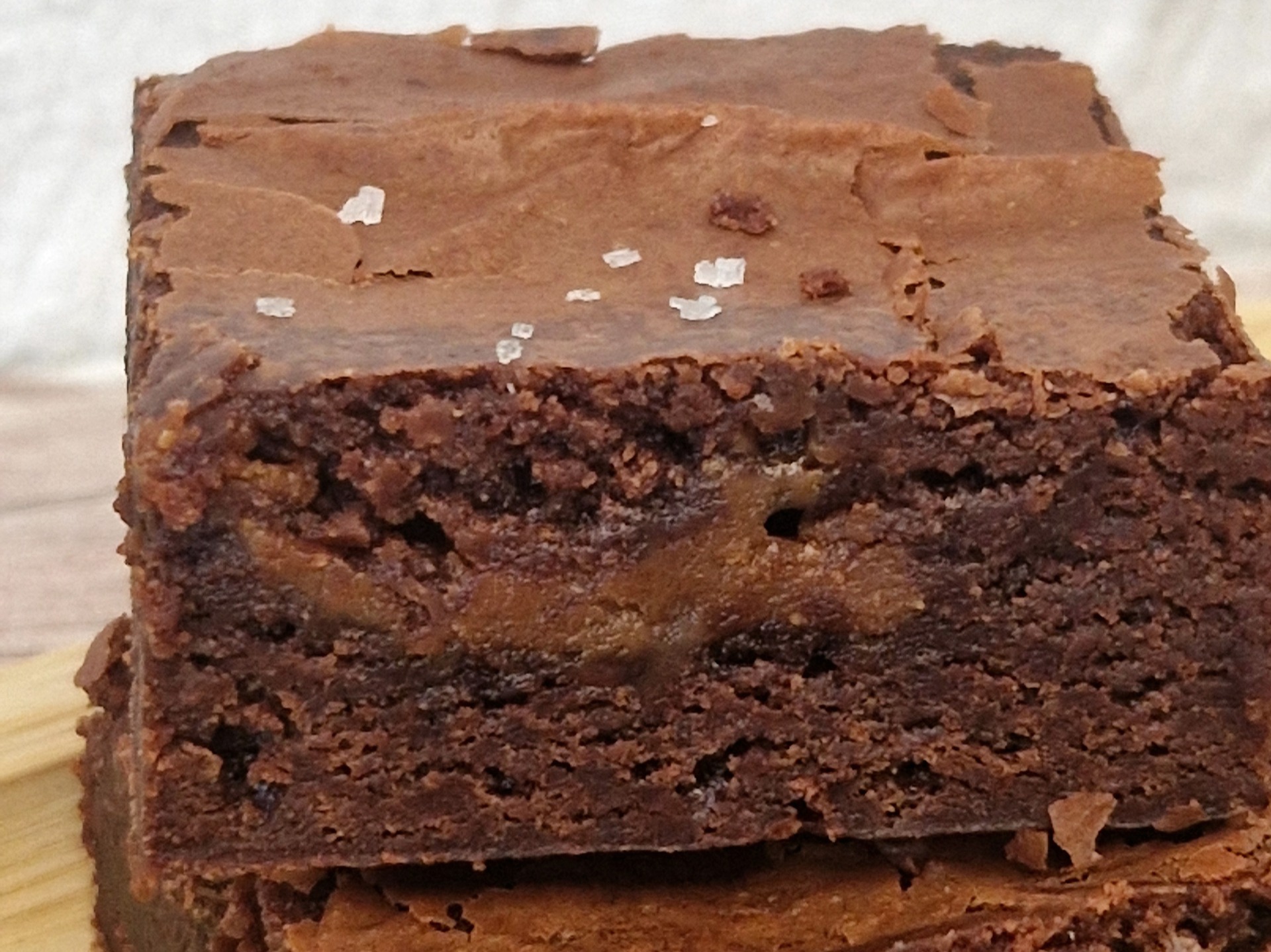 A brownie filled with salted caramel. On top, a delicate touch of sea salt flakes balances the sweetness and enhances the flavors, creating a perfect contrast.